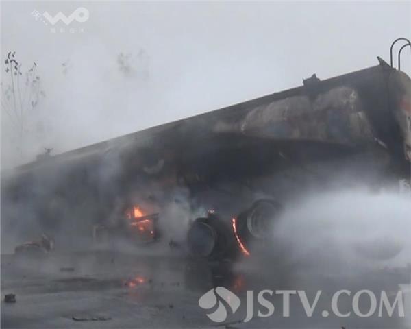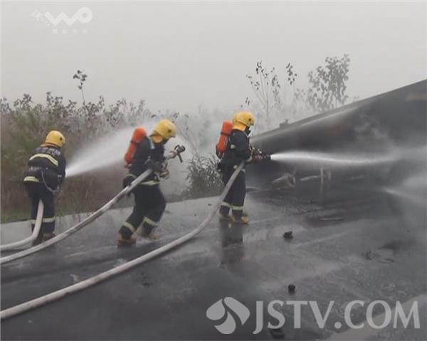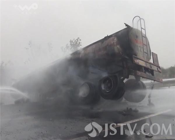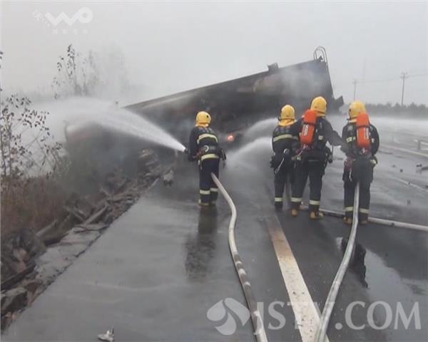 11月5日上午,宁连公路淮安市洪泽县境内,一辆从安徽开往淮安方向、装载30吨硫酸的槽罐车,撞上隔离护栏导致轮胎起火、硫酸泄漏。消防部门接警后迅速调集当地消防中队和盐碱科技产业园政府专职消防队赶赴现场处置。