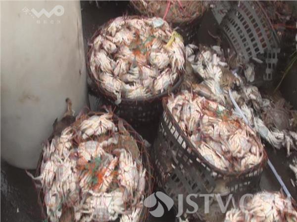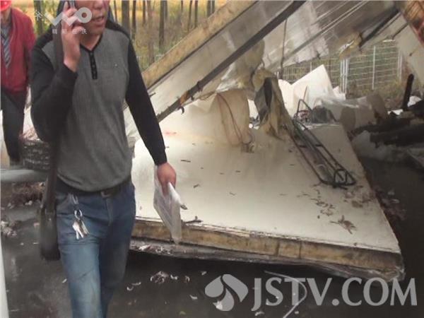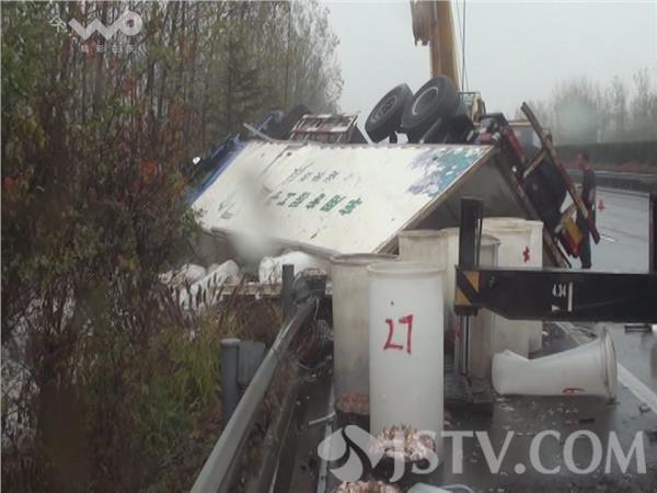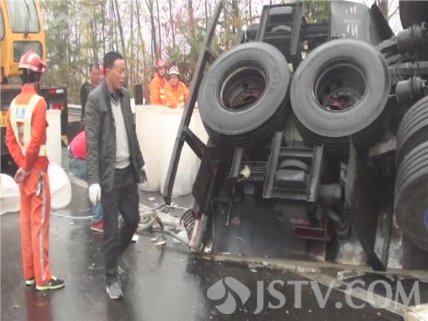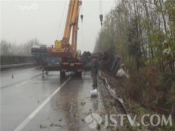 记者赶到现场时,高速交警和高速路政部门已在第二、第三车道设立警戒带,引导过往车辆从第一车道通行。一辆厢式货车车头向南斜翻在高速公路的东侧的斜坡上,货车车身占据了由南向北的第三车道,货车车厢已破损,车里装载的十几个白色塑料桶散落在地上,散落在地上的螃蟹热心市民和高速工作人员正帮车主捡拾放到篮筐里。
