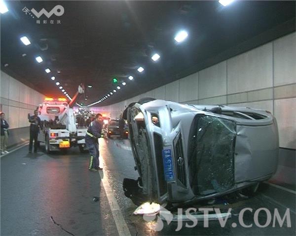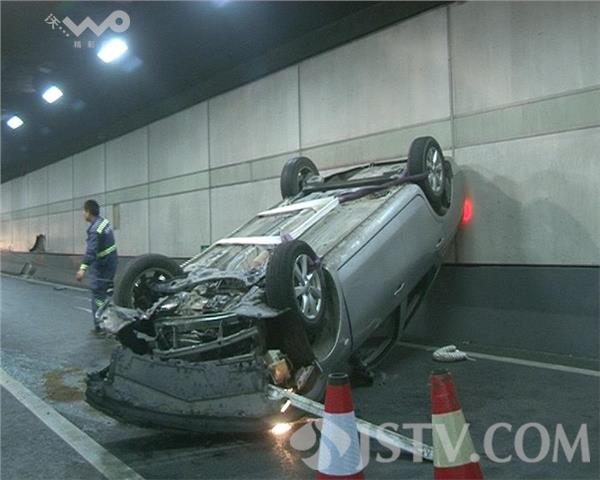 记者在现场看到,尼桑轿车四轮朝天翻倒在隧道里,车头损毁严重,事故发生后,司机王某自己从驾驶室里爬了出来,所幸没有受伤。在记者的追问下,王某承认自己当时超速行驶。