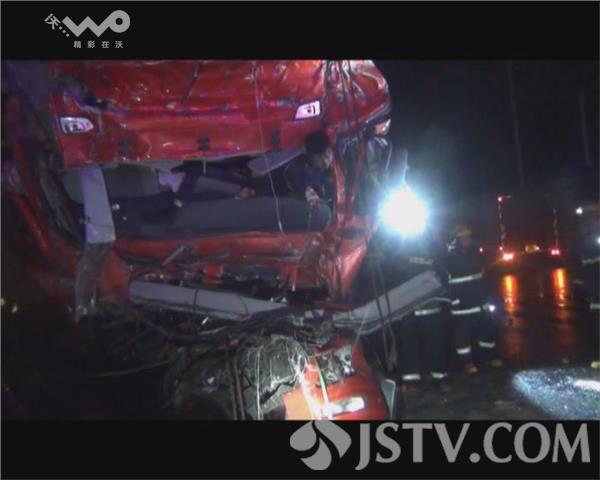 荔枝新闻记者赶到现场时发现追尾的货车车头因强烈撞击已经变形,车上两人一人昏迷一人受伤,被追尾的货车上货物洒落一地。消防队员迅速利用液压剪对车门进行破拆,随后使用液压顶杆对驾驶室进行扩张,使得有足够的空间可以将被困伤者救出。由于大雨增加了消防官兵的救援难度,追尾货车司机的头部被方向盘卡住,稍有差池便会对伤者造成二次伤害。经过20分钟的紧张救援,两名被困人员被救出。目前,事故原因正在调查中。