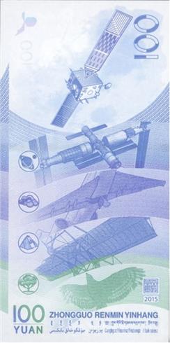 中国航天纪念钞主色调为蓝色。正面主景图案为神舟九号飞船与天宫一号交会对接图案。背面主景图案由上至下依次为嫦娥一号卫星图案、2020年中国空间站“天宫”、喷气式客机、冯如2号双翼螺旋桨飞机、飞禽海东青图案。票面左上角为风筝局部图案,右上角为面额数字“100”。