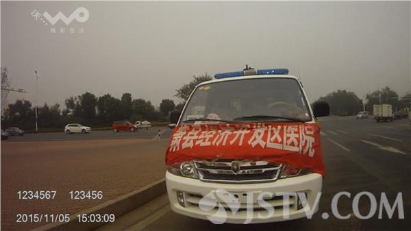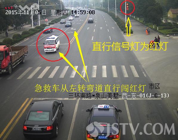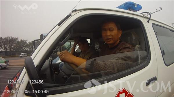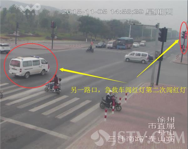 11月5日下午14时58分,徐州泉山交警大队民警金峰和同事驾驶警车在三环南路巡逻,突然一辆急救车闪着警灯从左边呼啸而过,民警透过车窗清楚地看到急救车里并没有病人和医护人员,只有一些器械在车内。而往前驶到下一个红绿灯路口时,正值红灯,直行车道排了十几米的长队,不料救护车竟然从左转车道闯红灯直行,还拉响了警报装置,被民警的执法记录仪清晰地记录下来。