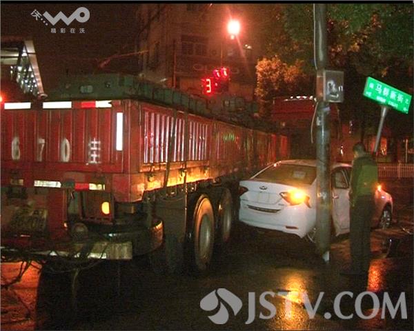 11月7号凌晨三点半左右,在南京市鼓楼区中山门大街与马群新街路口, 一辆长15米,载重量40吨的大型卡车在右转弯时,不慎将同向行驶的一辆新购 买的奇瑞轿车挤压变形,新车受损非常严重,好在没有人员受伤。
