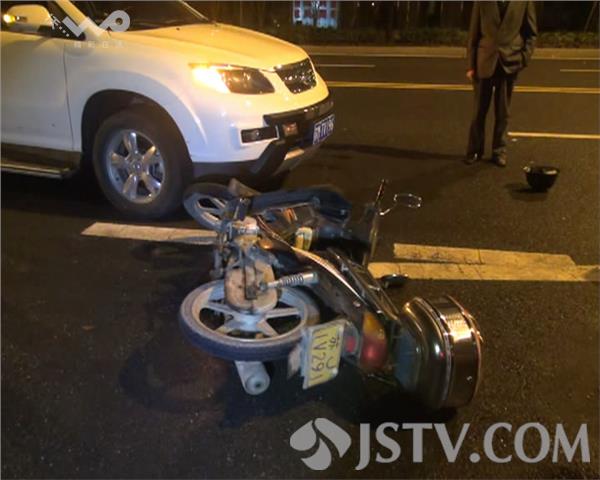 11月7日晚上8点左右,盐城市大丰市区新村路一个三叉路口,一辆轿车由东向西准备拐弯向北到一个居民点,这时一辆摩托车驶来,两车相撞,摩托车驾驶员被撞倒在地且肩部受伤,事故发生后轿车驾驶员立即报警,110、120接到报警后迅速到达现场勘查,摩托车驾驶员被120送往大丰区人民医院治疗。