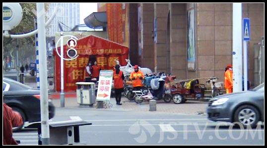 今天(11月12日)早上,荔枝新闻网友在淮安市区淮海东路与圩北路交叉口南侧看到一个红色的棚子,一百多名环卫工人在这里吃上免费的早餐。
