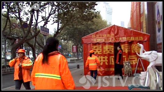 初冬的清晨,凉气袭人。肉、豆沙和菜三种馅儿的包子,一个茶叶蛋,一个小蛋糕,外加稀饭和小菜……对这顿早饭,在座的环卫工赞不绝口:这下好了,在这个温暖的棚子里吃免费早餐,真的是解决了“饥寒交迫”的大问题。