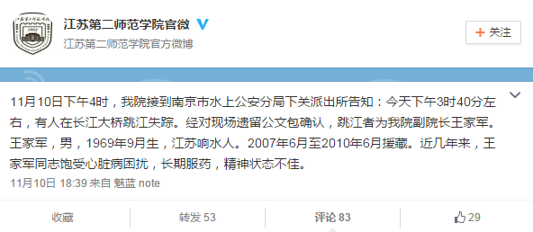 据江苏第二师范学院官方微博消息:11月10日下午4时,我院接到南京市水上公安分局下关派出所告知,今天下午3时40分左右,有人在长江大桥跳江失踪。经对现场遗留公文包确认,跳江者为我院副院长王家军。王家军,男,1969年9月生,江苏响水人。2007年6月至2010年6月援藏。近几年来,王家军同志饱受心脏病困扰,长期服药,精神状态不佳。