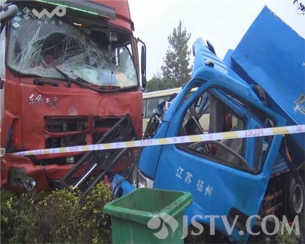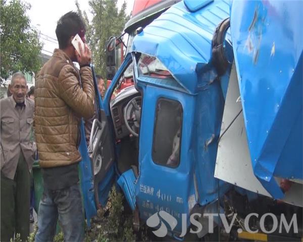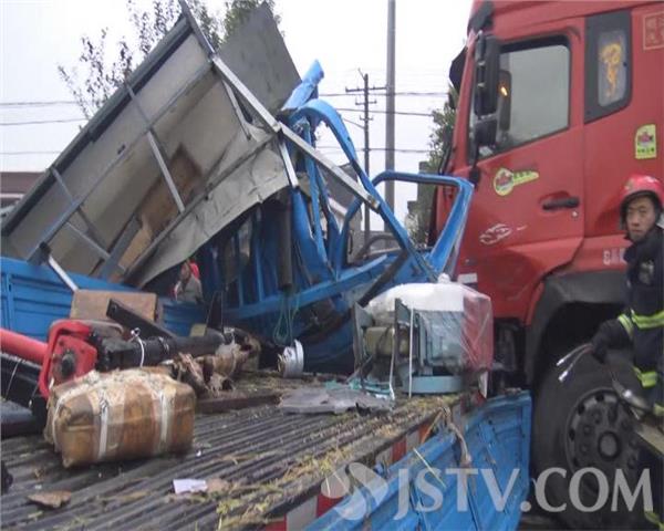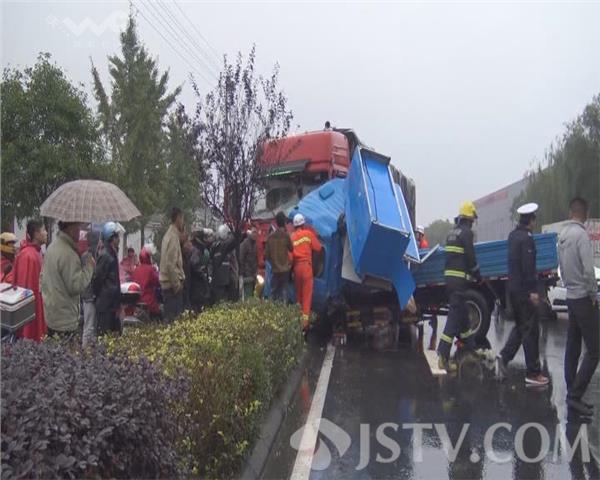 天空下着雨,一辆小货车冲进绿化带,与一辆红色半挂车相撞,横在车道上,车头严重变形,挡风玻璃破碎,副驾驶位置男子伤重昏迷,被困车内,毫无知觉。一名男子脸部受伤流血,站在车旁焦急地打电话。消防队员赶到,拿来扩张器与撑顶器,迅速展开救援。很快,救援人员撑开变形的车头,救出被困男子,抬上救护车,送往医院抢救。据半挂车司机介绍,当时他由东往西开,蓝色货车司机看到前方有车准备拐弯,立即刹车,可能由于雨天路面湿滑没有刹住,侧滑后冲向他的车道,撞了起来。