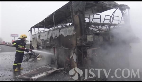 据客车司机介绍,他从新沂开往上海,行驶途中突然闻到异味,发现右后轮部位起火,赶紧靠边停车,疏散掉车内乘客,拿灭火器救火,无奈火势发展太猛,蔓延扩大,只好报警求救。