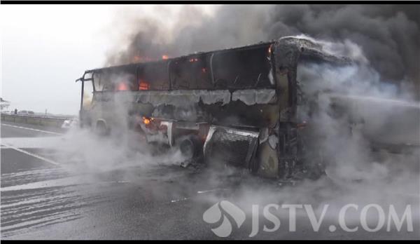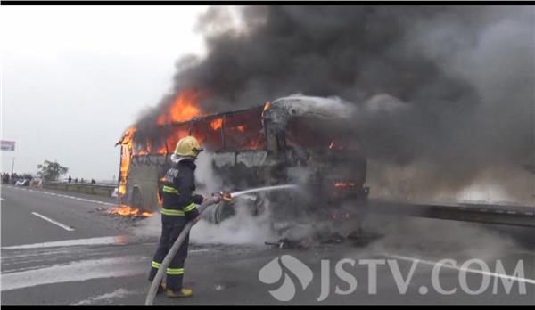 11月18日上午11点左右,京沪高速江苏扬州江都段,往上海方向970公里处,一辆大客车行驶途中起火,浓烟滚滚,瞬间变成“火车”,后侧轮胎烧爆,玻璃全被烧破,黑烟直蹿。消防队员赶到,立即铺好水管,展开扑救。在灭火的同时,喷水对油箱进行冷却,防止发生爆炸。