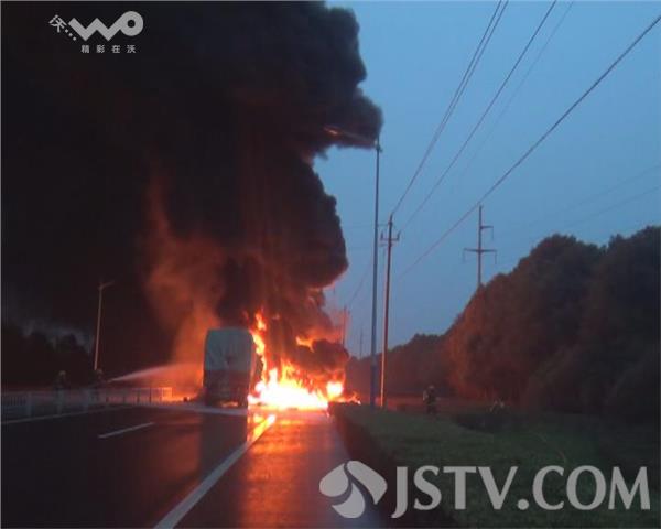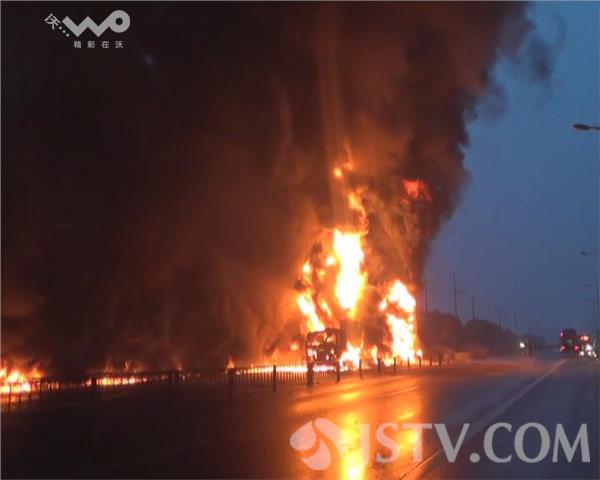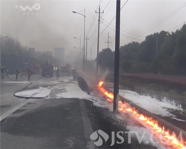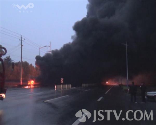 11月19日凌晨6点,104国道无锡宜兴市金鸡山南侧,一辆装有30吨二甲苯的危化品槽罐车被后方大货车追尾,导致槽罐车发生泄漏并爆炸,追尾大货车中还有人员被困,现场情况危急,接到报警后,宜兴消防大队立即调动4个消防中队11辆消防车近60名消防官兵赶赴现场处置。