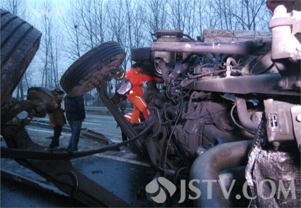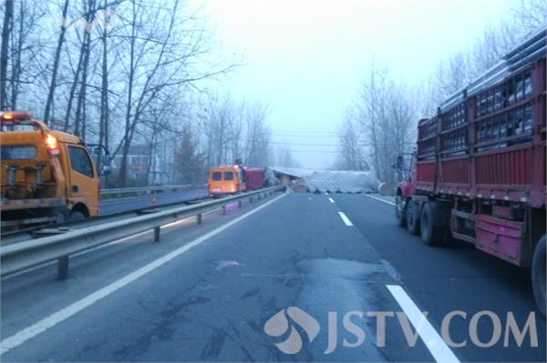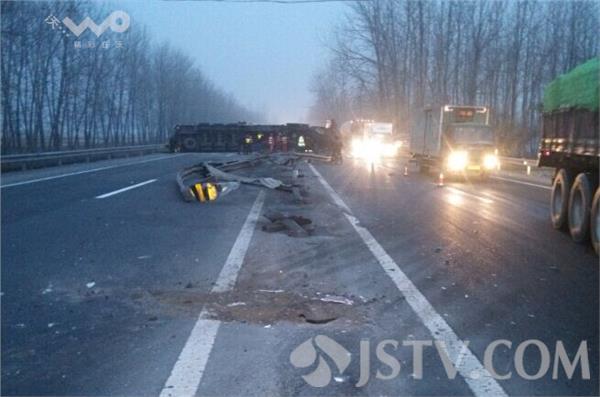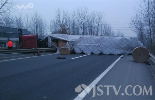 11月21日凌晨4:40左右,淮安市清浦区武墩镇G205公路1102公里处发生惊险一幕,一辆连云港牌照运送牛皮纸卷的半挂货车因为方向盘失控突然撞上公路中间的隔离护栏旋转90度侧翻在了逆向车道,由于司机避让及时没有人员伤亡。