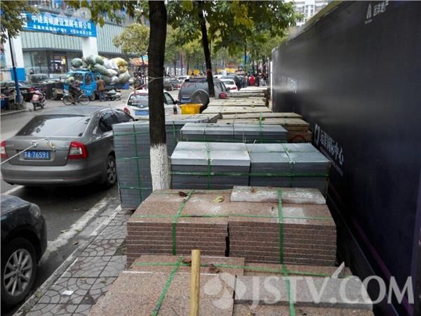 人行道俨然成了堆放石材的“仓库”,大理石石板整齐地码在一起,有一米多高。由于人行道被“霸占”,路边又是停车场,出行的市民只能从马路上通过,车辆来来往往,也给市民带来了安全隐患。