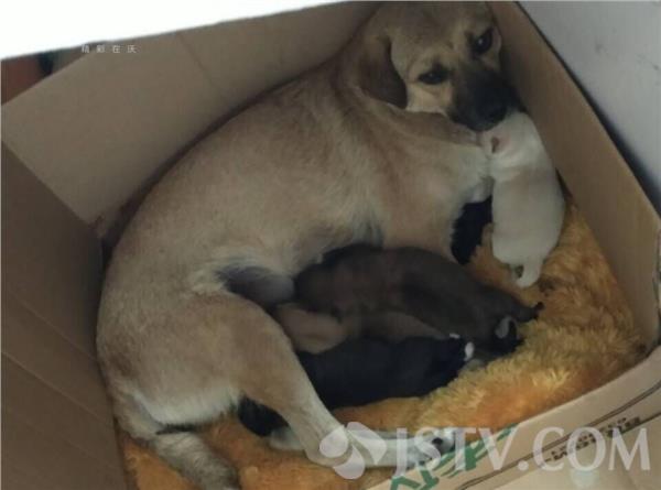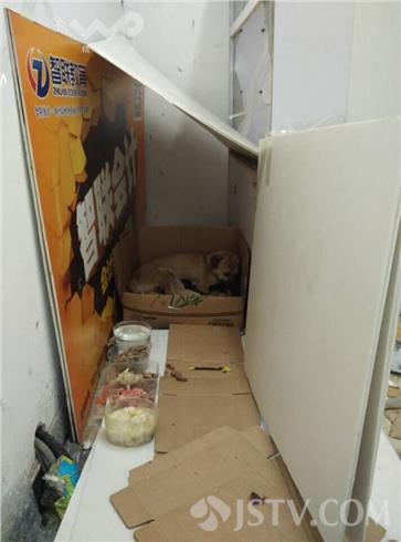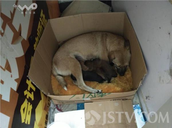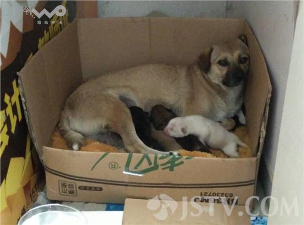 11月23日,在扬州大学商学院的校园里,一只名叫“阿黄”的流浪狗悄悄诞下四只可爱的宝宝,母子五只依偎在一起,在教育超市内部走廊的角落里安静地卧在铺上毛毯的纸盒里。