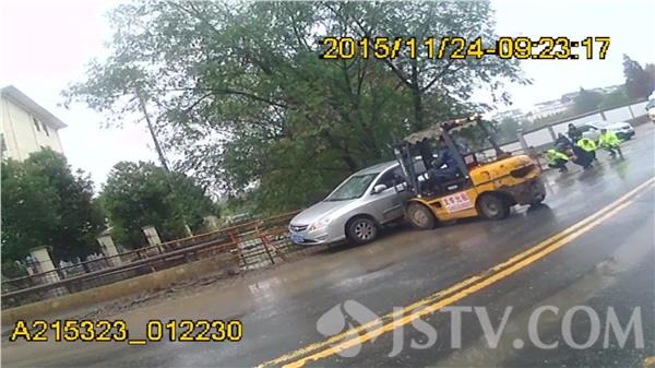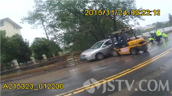 11月24日9时分许,南京交管局交警七大队百水桥中队民警在管辖区执勤巡逻时,发现宁杭公路S122省道百水桥高架桥咽喉路段的施工便桥处,小客车车轮卡陷到施工便桥夹缝处动弹不得,尾随的车辆纷纷绕行,车辆积压严重影响交通。执勤民警立即下车疏导交通,观察现场情况,并用电台将这一突发情况向大队指挥室汇报,同时电话联系周边施工单位紧急调度叉车现场救援。当时正在下雨,巡逻民警一边协助叉车救援,一边及时疏导交通。数分钟后,现场车辆被叉车托出夹缝,危急情况解除,车辆完好无损,沿线的交通也得以恢复畅通。被救助小客车驾驶员激动的向满脸都是冰冷雨水的民警连声道谢,感谢危难之中尽显交警真情!