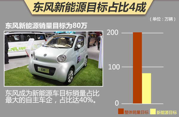 在八家自主车企中,有三家车企新能源销量目标占总体目标的比例最高,分别是吉利、东风和奇瑞。在东风“十三五”新能源乘用车发展战略研讨会上,东风公布了其未来5年的规划。到2020年,东风自主品牌累计销量目标为200万辆,其中,新能源车销量目标为80万辆,占比高达40%,成为新能源车目标销量占比最大的自主车企。