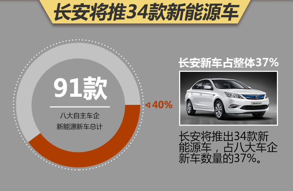 据长安汽车的相关负责人透露,在未来十年内,长安汽车将投资180亿元,推出34款新能源车,销量目标为200万辆。在长安的五年规划中,2年内,长安将推出9款新能源车。重庆长安新能源汽车有限公司总经理任勇曾表示:明年长安将有一款续航里程达250km的新能源车型 上市。而2017年则是长安新能源车型集中投放的一年,会有8款新车推出,由此算来两年长安共将推出9款新能源车型。据了解,在2017年长安即将投放的新能源车型中,将包括MPV、轿车、商用车三种类型。