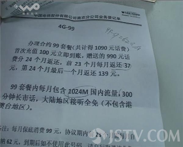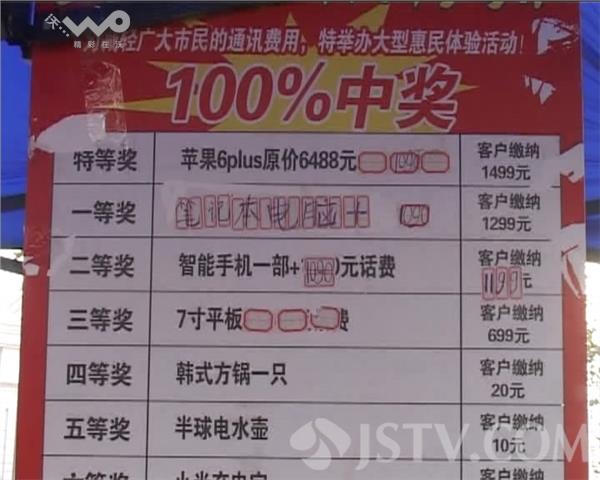 现场据李某称,自己当时路过这里,见很多人在此免费砸金蛋并且中奖,自己一时兴起也加入了进去,刚砸了一个,没成想竟然中奖了,还中得一个2等奖!经摊主指点,2等奖除了能得一部手机外,还另得1090元的花费,自己当时十分开心,在被摊主带到附近的电信营业厅兑奖后,才发现自己原来被莫名其妙办理了一个电信套餐,即每月需保底消费99元方可,可在中奖所得的1090元中,每月只能返还到账37元(分24个月返还),剩下的62元,自己还得自己每月补上充值才行,这哪里是中奖啊?分明在用套餐骗人!