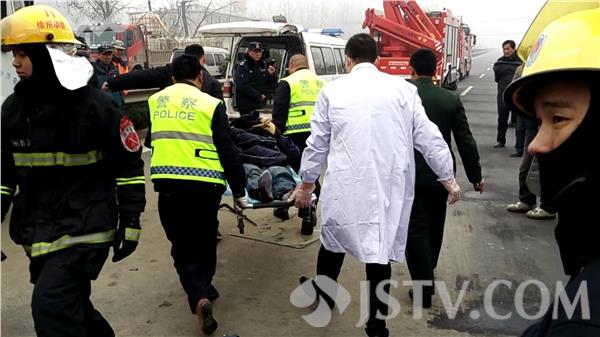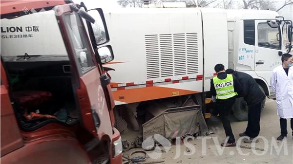受雾霾天气影响,11月30日上午9时32分,徐州新沂市205国道夏塘段一辆载有30吨液碱的危险化学品槽罐车撞到了道路清扫车,槽罐车驾驶员被困在了驾驶室内,下半身被变形的车头卡住,身体无法动弹。