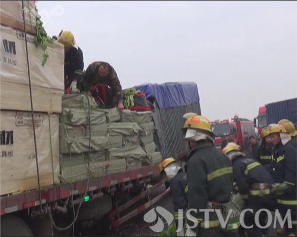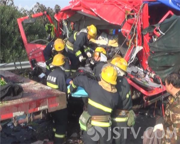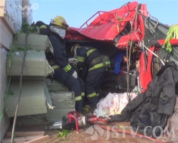 救援人员接警后迅速赶到现场发现,一辆装满蔬菜的大货车与一辆满载建筑用木材的半挂车发生追尾,大货车驾驶员被卡在变形的驾驶室中,动弹不得,救援人员先将货物清理干净后,立即使用液压扩张器、无齿锯等工具对变形的驾驶室进行破拆。但由于两车追尾力度较大,驾驶室变形严重,破拆遇到了阻力,现场人员立刻调来吊车和拖车,配合救援人员,最终成功将被困人员救出,但遗憾的是由于伤势严重,被困驾驶员被抬出后经医护人员检查,已经死亡。