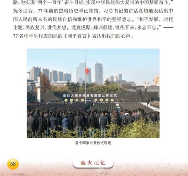 与此同时,南京出版社以《南京大屠杀死难者国家公祭读本》(初中版)修订本为底本,同时吸收小学版、高中版的部分重要知识点和珍贵图片,邀请国内一流的专家,精心推敲打磨,首次将这段史实编译成英文和日文版《南京大屠杀死难者国家公祭读本(简明版)》,让全世界热爱和平的人们都能够了解到那段历史,向世界人民展示中国人民反对战争、爱好和平的意愿,与对未来和平幸福生活的向往。