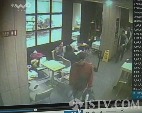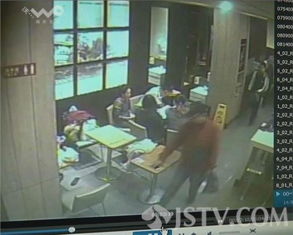 当天晚上7点06分,一名身穿红色外套、戴着帽子的男子,从张同学放置手机的桌子旁路过,将手机拿走、放在了裤子口袋里。