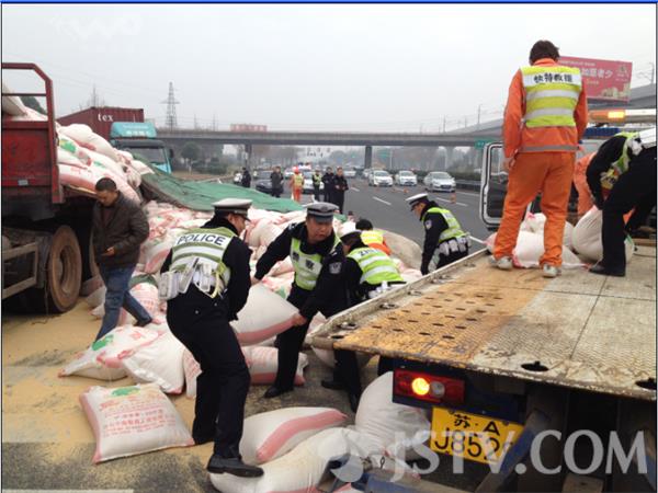 2015年12月1日清晨,一辆货车后轮轴突然断裂,车上装载的30吨豆粕部分洒落在六合大道上,严重影响了交通畅通,南京交管局十大队积极快速处置,民警、辅警手抬肩扛帮助清理货物,很快恢复了交通。