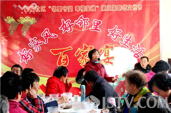 这时,前面舞台上乐器声起,“会两手”的居民,开始陆续登台,给食客们助兴。趁着大伙儿吃的开心、唱的尽兴之时,社区主任包卫东介绍,以往社区居住的居民,相互不认识,一个楼梯门对门,老死不相往来,给和谐社区建设带来了阻力,也给社区工作带来了压力,在打造法制社区和幸福社区建设中,我们在成功地举办了第一届和第二届奎楼社区睦邻文化节“百家宴”后,感觉到这是一种团结邻里、建设和谐邻里关系的好办法。奎楼社区几万居民,来自五湖四海,虽然风俗相同,但每一家的生活习惯各不相同,通过每户提供一个拿手的“家常菜”,到社区参加“百家宴”,既可以将自家传统的“绝活”,呈现在社区居民面前,又可以品尝到邻居家不同风味,还可以促进社区的邻里团结,真可谓是一举多得。这个活动推出后就得到了社区居民的热捧,从第一届的象征性“百家宴”,到去年接近百种“家常菜”参加,再到本届122道家常菜,成为名副其实的“百家宴”。