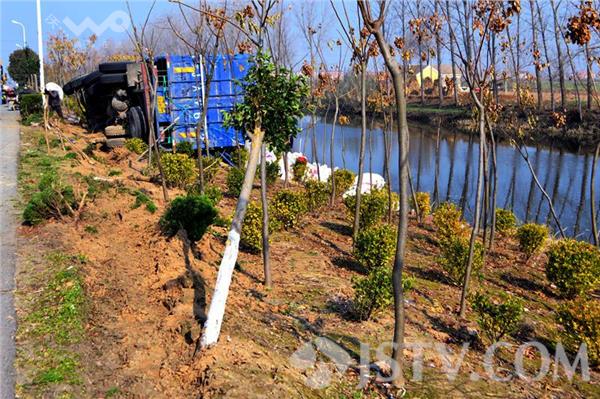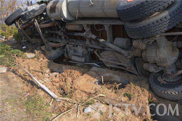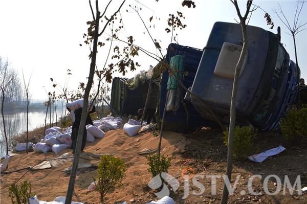 记者赶到现场时,几名搬运工人正在帮忙搬运货车上的货物,一辆大货车头朝北侧翻在路右边的护坡上,车上满载的货物散落一地,车厢右侧的挡板弯曲变形,护坡上的泥土被车轮碾压出很深的痕迹,窨井上的水泥盖被掀开,露出多根电缆。一名在现场围观的村民告诉记者,听驾驶员讲,他在行驶过程中,突然感觉到刹车被抱死,随即方向失控偏向右侧后就侧翻了,好在当时路边没有行人和车辆,否则后果就不堪想象了。