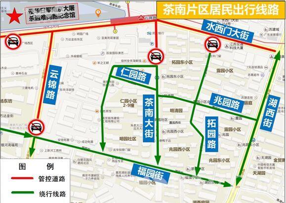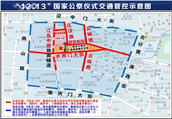 管控措施1:12月13日7时至13时,水西门大街(北圩路至燕山路段)、茶亭东街、江汊路、纪念馆北路、云锦路(汉中门大街至茶亭东街段、水西门大街至福园街段)、江东中路地面辅道(汉中门大街至福园街段),除持有公祭仪式专用车证的车辆及执行紧急任务的警车、消防车、救护车、工程救险车外,禁止其他车辆通行。