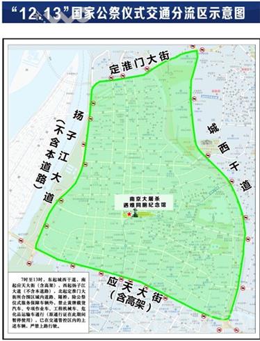 12月13日7时至13时,东起城西干道,南起应天大街(含高架),西起扬子江大道(不含本道路),北起定淮门大街所合围区域内道路、隧桥,除公祭仪式服务保障车辆外,禁止黄牌载货汽车、专项作业车、工程机械车、危化品运输车通行(原通行证在此期间暂停使用),已在交通管控区内的上述车辆,严禁上路行驶。