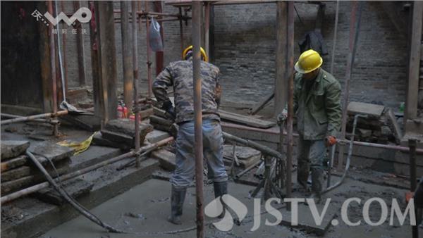 进入到糖坊廊61号,记者看到,房屋的顶部已经被揭掉,维修支架全部搭建起来,工人们正在进行施工。现在的工作是灌浆,因为糖坊廊61号年久失修地基已经出现了塌陷,尤其是南边。主要对地基进行加固防止再次塌陷。