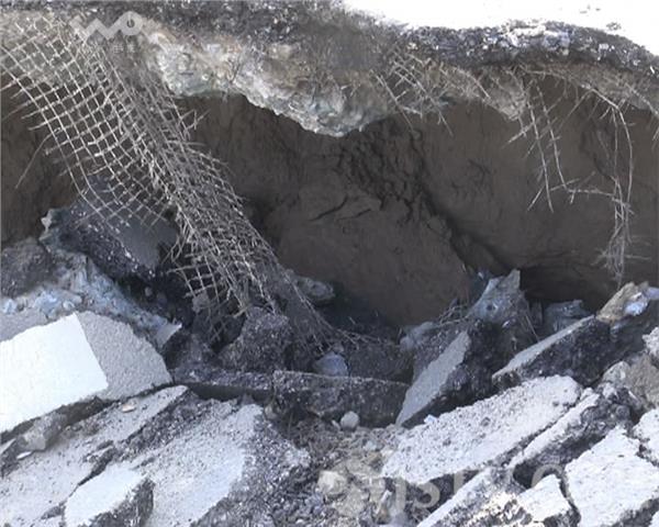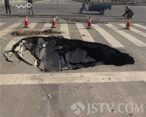 记者在10点到达现场,看到现场工程车已经被吊了上来,路面上有一个直径约在4米左右,深约2米的深坑。记者仔细观察了一下,在坑的南侧沥青路面下面全部是空的,上面有一层网,网上连着不少沥青,坑四周全部有裂缝,在坑的西侧倒着一堆泥土。路的两头有工人在用钢管把路封上了。