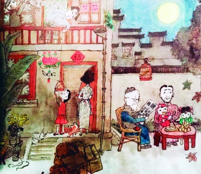 画中的孩子们脸上一派天真,吃月饼、斗鸟、赏花;大人们则愁眉不展,因为那一天,不远处的评事街遭到了轰炸。院子里堆着家人准备逃亡的行李箱。