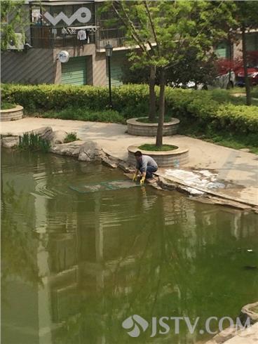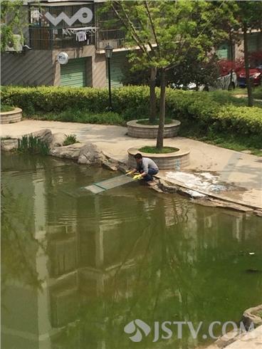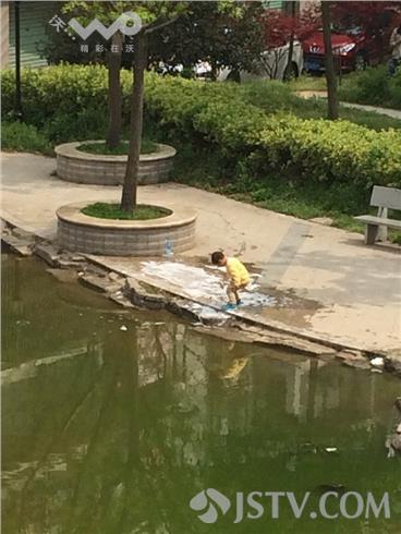近日,南京天好,浦口区盘城花园小区居民开始洗洗刷刷了。该小区有居民在池塘边用洗衣粉在洗纱窗。洗过后,不清理岸边的肥皂沫。小区的孩子兴奋地在上面奔跑。