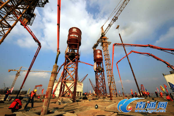 大桥建设者们有序分组,按照预定的施工方案,职责明确、有条不紊地忙碌着自己手头的事情。工程技术人员不时测量各灌注点的混凝土面上升标高、统计数据,试验人员严密监测混凝土生产质量,现场对讲机的声音此起彼伏,与泵送混凝土发出的低鸣声汇聚成一首江上施工交响曲。