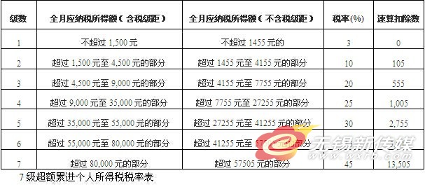 地税四分局工作人员介绍了这笔个人所得税款的计算方式。“巨额”税款是对应2011年9月1日起实行的个人所得税工资薪金的扣除表后计算得来的。工资个税的计算公式为:应纳个人所得税税额=(工资薪金所得-“五险一金”-扣除数)×适用税率-速算扣除数。个税起征点是3500元,使用超额累进税率的计算方法,全月应纳税所得额(含税级距)不超过1500元的,税率3%; 超过1500元至4500元的部分,税率10%; 超过4500元至9000元的部分,税率20%; 超过9000元至35000元的部分,税率25%; 超过35000元至55000元的部分,税率30%; 超过55000元至80000元的部分,税率35%; 而超过80000元的部分,税率达到45%。