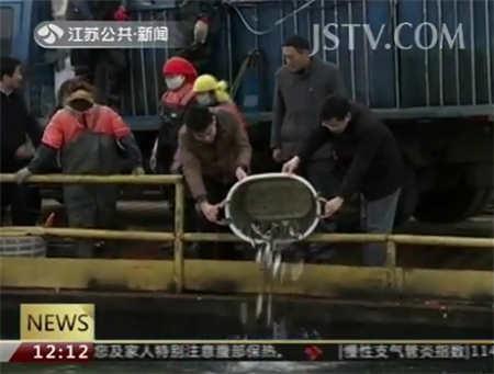 下午三点,三车鱼苗被运输船只运送到骆马湖国家级水产种质资源保护区水域,随着采样检查的结束,鱼苗被工人们投放到骆马湖。8号当天增殖放流的鱼苗有两万多斤,约20多万尾。江苏省骆马湖渔管办资环处处长高军表示,这次放流的苗种规格大、体质好、成活率高,增殖放流的效益体现得比较明显。