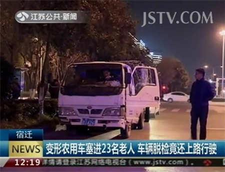 近日,宿迁市交警部门查处了一辆改装农用货车,让人吃惊的是,除去驾驶室的两名人员,车厢里硬生生塞进了23名老年人。