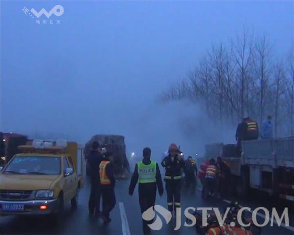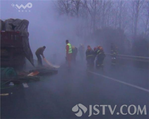 12月10日凌晨3点30分左右,京沪高速扬州宝应段一辆装载23吨五氯化磷的大货车紧急刹车,车上危化品桶因惯性几乎都翻下车。正逢下雨,泄漏的危化品遇水猛烈反应,情况紧急。当地高速交警、消防、路政等部门接警,迅速赶赴现场处置。