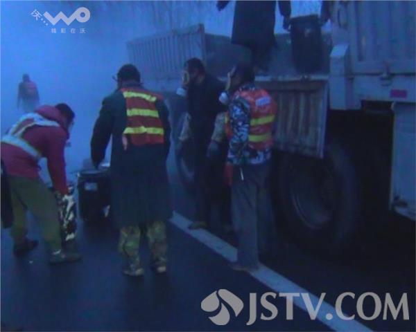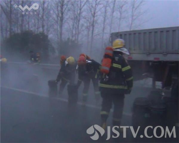事故现场,一辆安徽籍装载危化品大货车停在高速上,五氯化磷桶滚落在地,不少破损泄漏,遇雨水强烈反应,腾起浓浓的烟雾,有刺激性,情况紧急。消防队员赶紧佩戴好呼吸器,勘察泄漏情况,与其他救援人员把危化品桶往车上搬。由于桶又多较重,很难抬起,给处置带来一定困难。