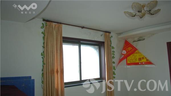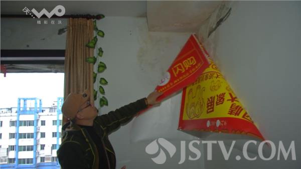 刘先生是江宁区湖滨公寓的住户。08年搬进这里不久,正好赶上了街道亮化工程,房屋临街的一面被装上了造型架。当时也没有什么问题看不出来,过了一段时间有点小渗漏。一开始刘先生还能自己修补,可后来漏水的面积越来越大。刘先生表示,就是室外临街出新过程中搞的造型架导致的,这个支架从室外明显看得到有水迹。