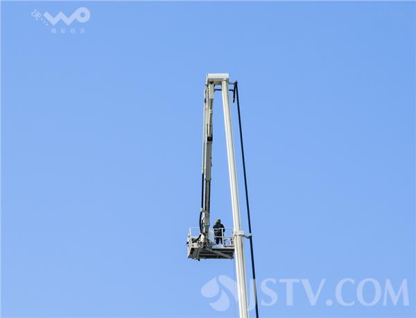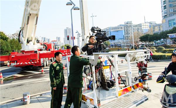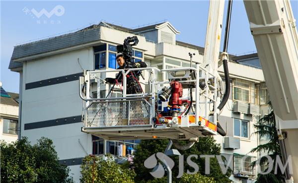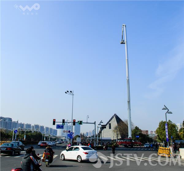 今天上午,荔枝新闻通讯员在江东门纪念馆现场看到,大批记者携带摄影设备在现场试拍,其中最引人注意的是一台68米的消防云梯,摄影师站在68米高操作台,对着仪式现场俯拍,场面震憾。试拍完后摄影师说,68米高空晃动的很,好在今天风不大。笔者看到云梯车四轮腾空,由四个铁柱子固定,底座看起来很稳,但上部还是晃,摄影师和摄像机都用安全绳系在工作台上,保证人和设备的安全。