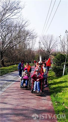 九点半,活动如期举行,工作人员按四名志愿者两名残疾朋友一辆车进行安排,13辆车浩浩荡荡从福利院开出,第一站中山陵绿道,从绿道的森林氧吧开始行走(福利院的残障朋友,坐在轮椅上,由志愿者推着)一路上大家愉快的聊天,志愿者向很少出门的残障朋友介绍沿途景点,一在中间的水榭吃午饭修整时,志愿者帮残障朋友端来午饭,并喂手不方便残障朋友吃饭,一点多钟,到了体育公园,大家合影留恋;