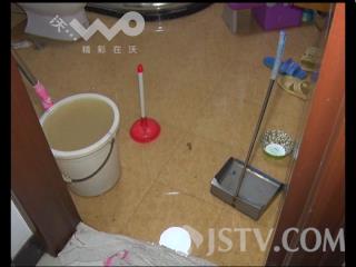 记者随民警来到现场后,看到汪师傅家卫生间一片汪洋,臭水肆意流淌。汪师傅的儿子汪先生介绍,现在只要楼上有人倒脏水,就会流到他们家。