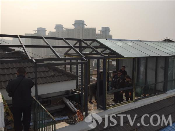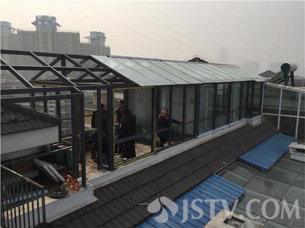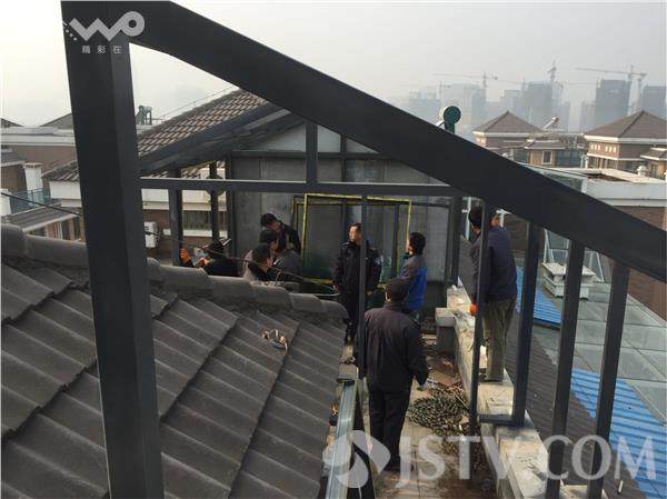 今天上午(12月15日),记者来到南京河西的横塘西苑小区,来到小区9栋901室的楼顶,向902室的楼顶逃生平台看去,两三个工人,正在一个钢结构的违建框架里,进行施工。见到记者拍摄,施工人员很快消失。据该栋楼901室的居民说,902室的户主所盖违建,占用的是顶层的逃生平台,面积有一二十个平方。安全通道阻断了,二,两家是连着安全隐患问题。