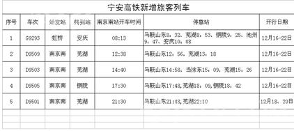 荔枝新闻记者获悉,为满足旅客出行需求,12月16至22日南京南站增开宁安方向5趟动车组列车,具体车次和运行时间见图。