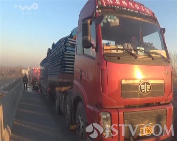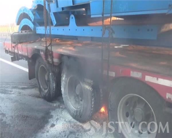 当消防队员赶到火场时发现,桥面上停着一辆半挂货车,货车上满载着筑桥用的钢制模块,半挂货车右后轮起火,火势已被司机利用干粉灭火器成功压制,但仍有余火还在继续燃烧。消防队员针对现场情况,迅速出一支水枪对火势进行扑救,5分钟后,火势被彻底扑灭。