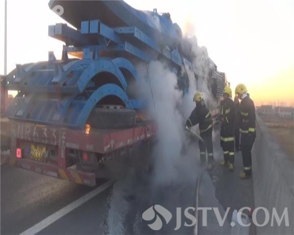 12月17日清晨7时08分许,江苏新237省道淮安市淮安区新长铁路大桥上一辆行驶中的半挂货车突发自燃,当地消防部门接到报警后,迅速赶赴火灾现场实施扑救。