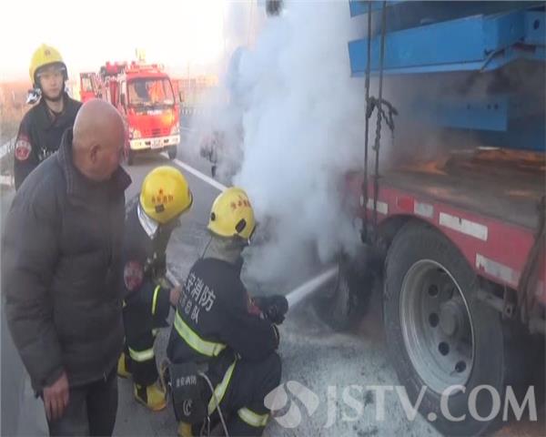 据着火货车司机反映,货车是由沭阳开往宝应,当车行驶至该路段时,突然通过后视镜发现右后轮胎冒烟,于是赶紧将车停靠路边查看原因,当车刚停下,火势便从轮胎处冒出,于是自己赶紧利用车上的干粉灭火器进行自救,同时拨打“119”火警电话报警。庆幸的是自己利用干粉灭火器成功压制火势,加之消防队员及时赶到将火势彻底扑灭。如果车上没有配灭火器的话,整个货车将被烧毁。